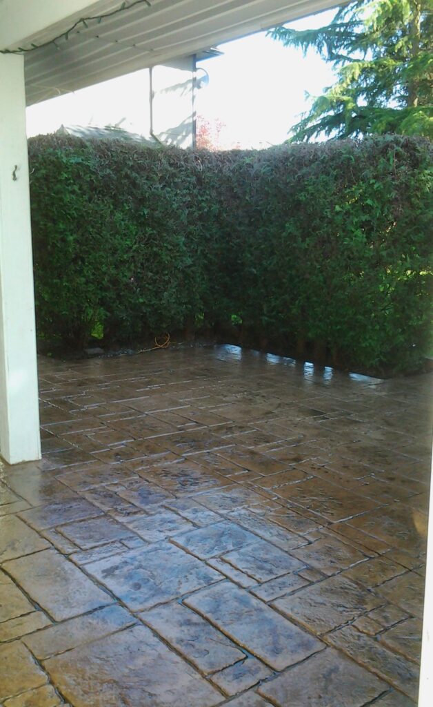 1) Does the company use liquid or powder release? A release agent is what keeps the rubber stamp mat from sticking to the concrete. Powder release is a much older methodology, it involves the spreading of a coloured powder over the wet concrete surface, some of which gets stamped into the concrete. After the concrete hardens, most of the powder is washed off, leaving quite a mess behind, the powder is not environmentally friendly for this reason. Alternatively, liquid release is clear and sprayed on, it does not involve a colouring agent and is far less toxic. It allows for a better quality stamp impression and application of accent colouring after the pour. This allows for better colour control and far less mess. Other benefits are that once concrete has been covered in powder release it is no longer able to be troweled while liquid release allows for this. This means if your dog happens to run over the concrete while we are still there it can be repaired.